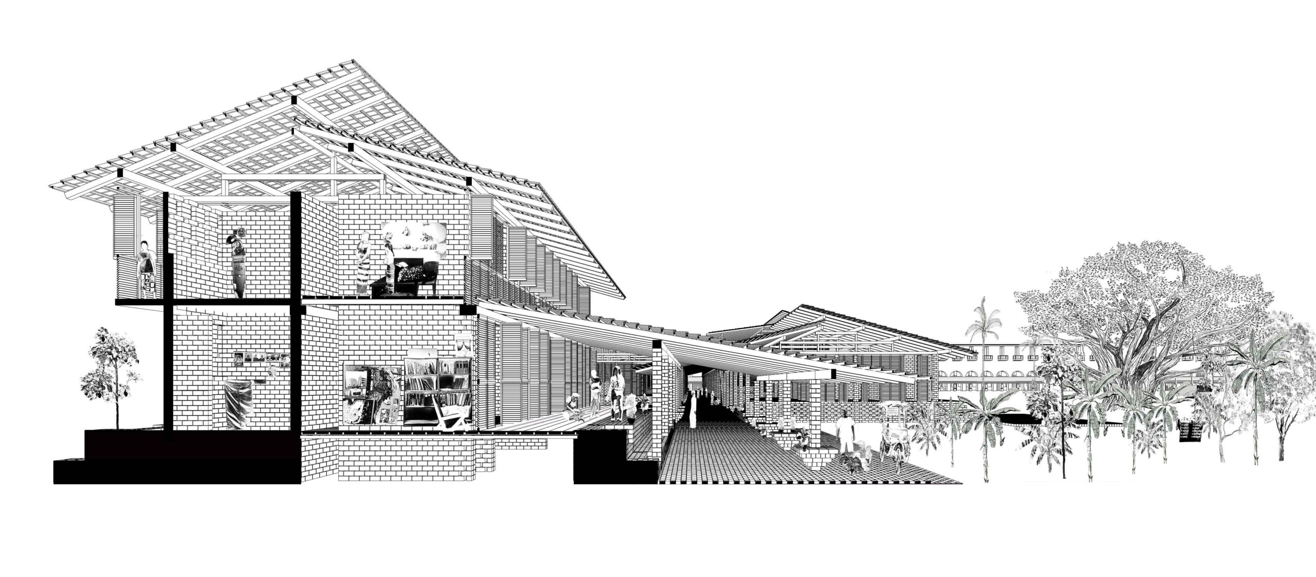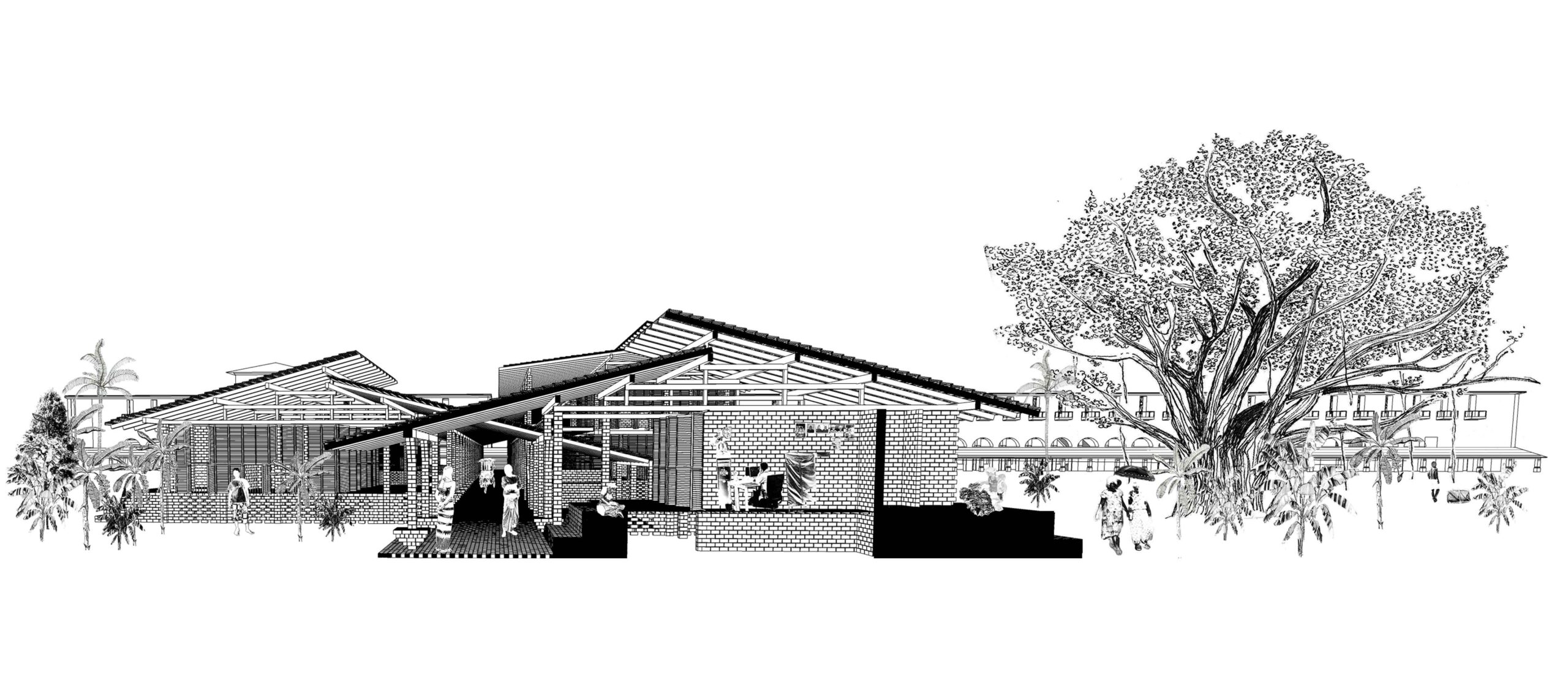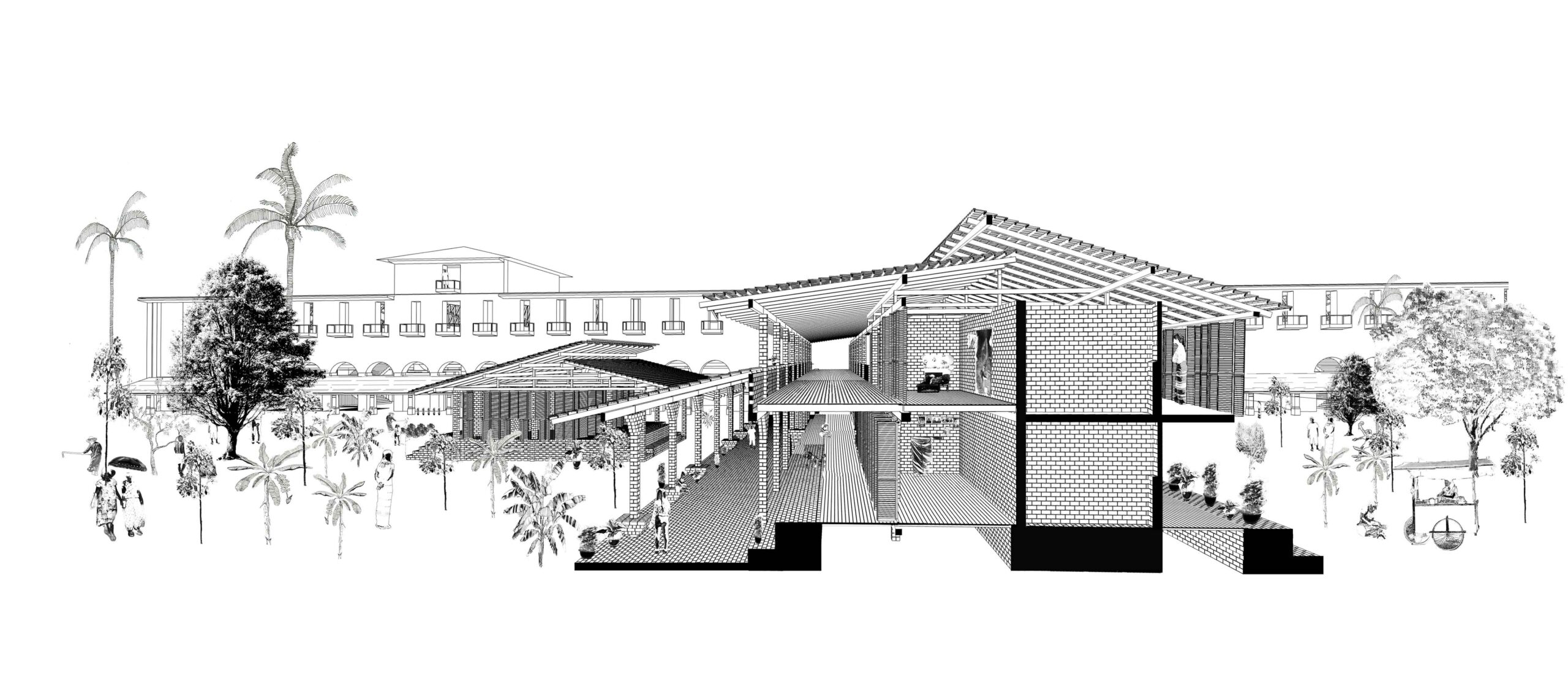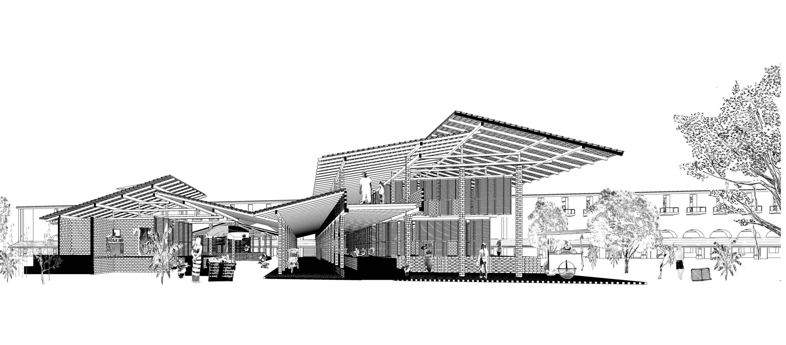 Un travail urbain est réalisé (voir urbanisme). Un second travail architectural est produit pour répondre à l’ambition commerciale et reloger les habitants. En nous inspirant de l’architecture vernaculaire, nous proposons une entrée couverte qui protège du soleil en saisons chaudes et de la pluie lors des moussons. Un dispositif de double toiture et de surélévation permet la ventilation naturelle. Dans cet édifice en bois local et brique de terre compressées, habitations et commerces se mêlent aux tribunes rouvertes au public. Le bâtiment donne une entrée majeure et devient un lieu de destination pour ce nouveau parc habité.