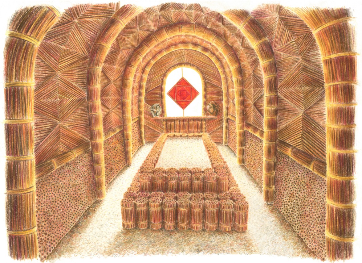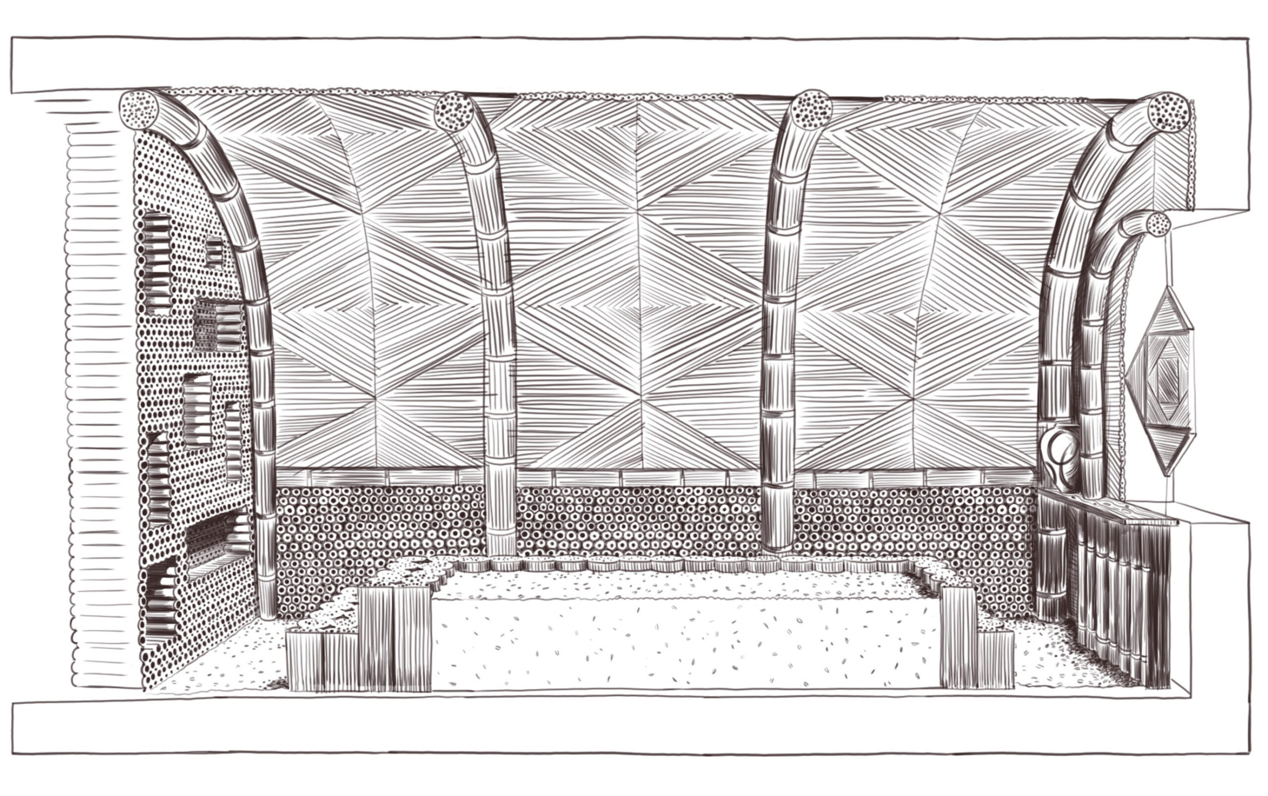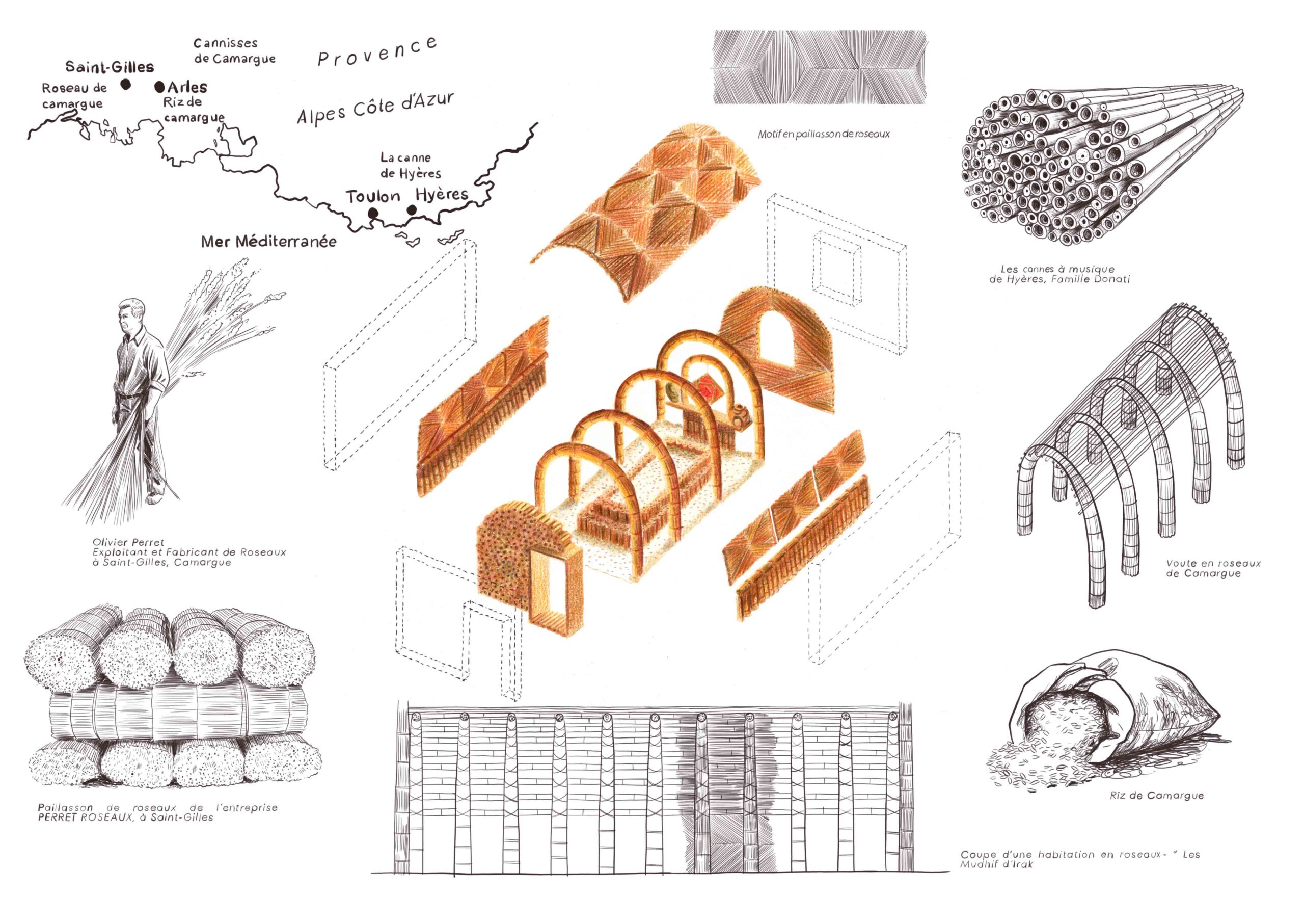 Chaque détail célèbre les richesses de la région. Le roseau de Camargue se mêle à la canne à musique de Hyères pour former des parois tressées, diffusant une lumière douce et mouvante, évoquant les reflets des étangs salins..