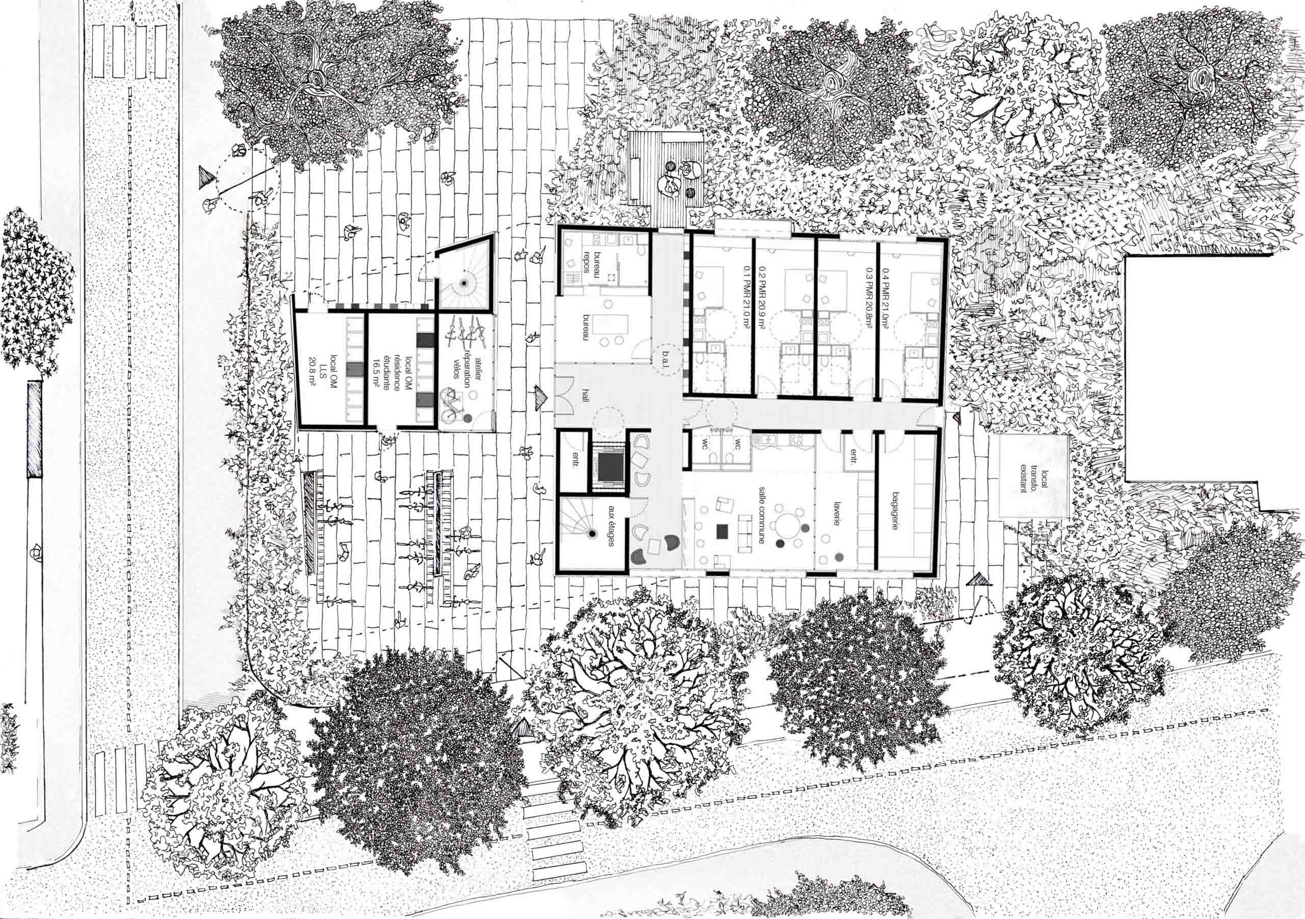 Construite entièrement en pierre de taille, cette résidence étudiante offre de vastes chambres avec de grandes baies vitrées. Le rez-de-chaussée est dédié aux espaces collectifs, dont quelques chambres adaptées aux étudiants à mobilité réduite. Les étages sont quant à eux dédiés aux chambres, avec de vastes couloirs éclairés et ventilés naturellement de part en part.