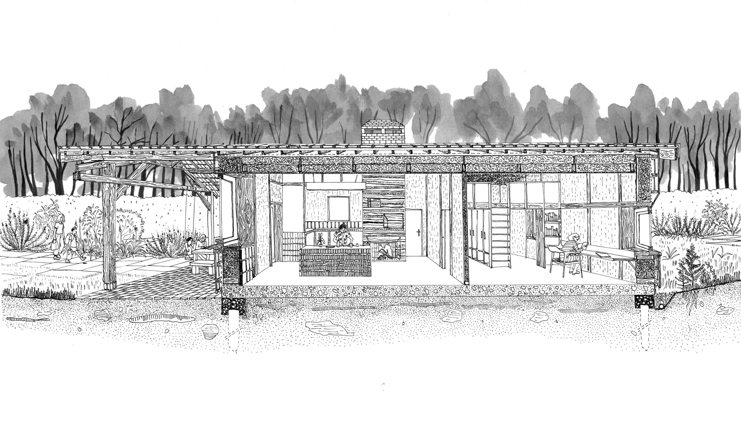 Cet abri à foin, malgré son âge et son état d’usure, est chargé d’histoire. Il témoigne de la collaboration entre deux agriculteurs du bourg qui l’ont longtemps partagé avec les nouveaux arrivants. Face à l’explosion des demandes en personnels saisonniers, nous avons transformé cet abri en habitation écologique. Nous avons conservé le bardage bois existant. L’édifice est conçu en ossature bois avec un remplissage terre-paille et un mur de masse en torchis. Les aménagements sont conçus en toile de jute, chêne local et en briques recyclées.